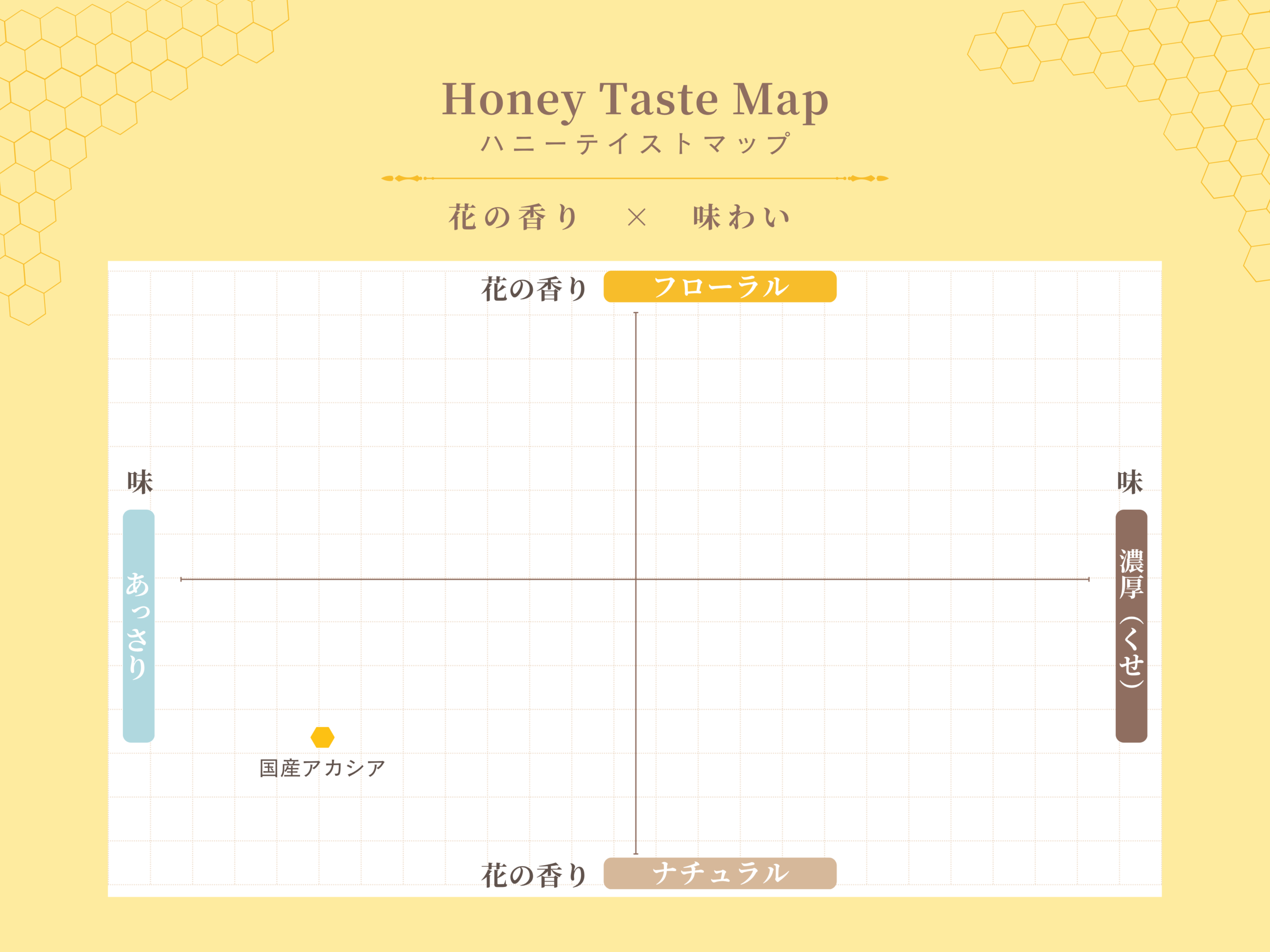 国産のアカシアはちみつです。上品な甘み、やさしい味わいのはちみつです。使い易いポリ容器を使用しています。